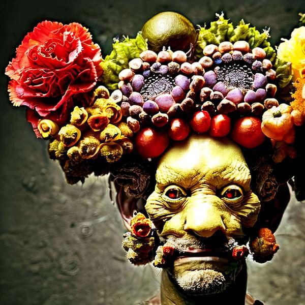 制作者と AI (AI アート作成用のプログラム Stable Diffusion 2.1 (768)) とからなるアートユニット anonymous による画家風のアート画像です.そのプログラムに「arcimboldo」ということば (prompt) をあたえて創造させました. 負のプロンプトとして「severini」を指定しています.