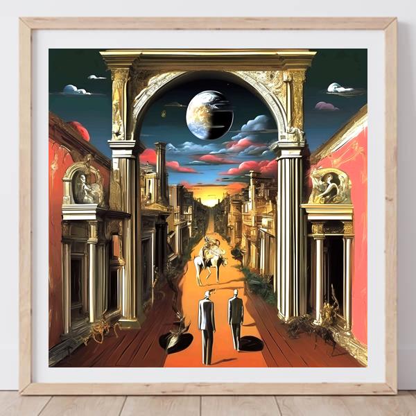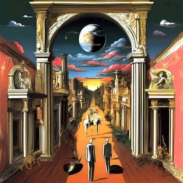 制作者と AI (AI アート作成用のプログラム Stable Diffusion XL 1.0 (1024)) とからなるアートユニット カナブストラクド によるアート画像です.そのプログラムに「Kanabstracd surrealism Chirico」ということば (prompt) をあたえて創造させました. 負のプロンプトとして「Chirico coarse_checker」を指定しています.