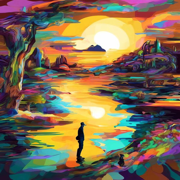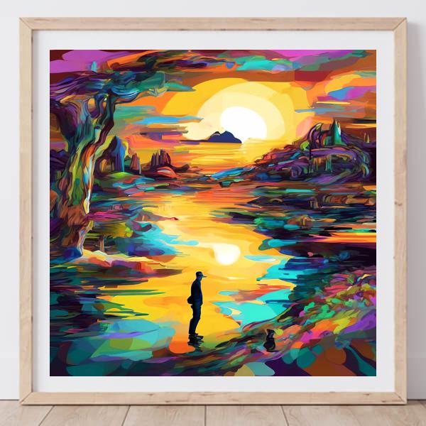 鮮烈な色彩で満たされたこの風景画は,日没か日の出の強い光を背景に人物のシルエットが水面に佇む瞬間をとらえています. 輪郭はあえて簡略化され,色面の重なりと筆致風のタッチが画面全体にリズムを与え,反射する陽光が暖色を軸に冷色を引き立てて奥行きを作っています. 左右の樹や岩の配置が視線を中央へ導き,人の存在がスケール感と静けさを際立たせています.