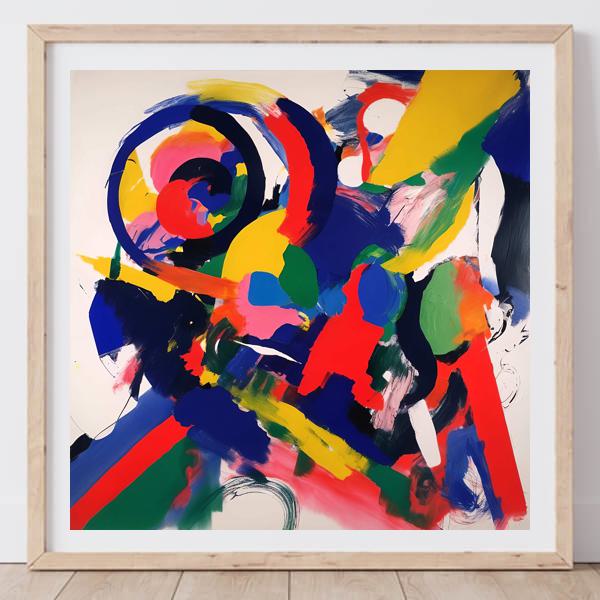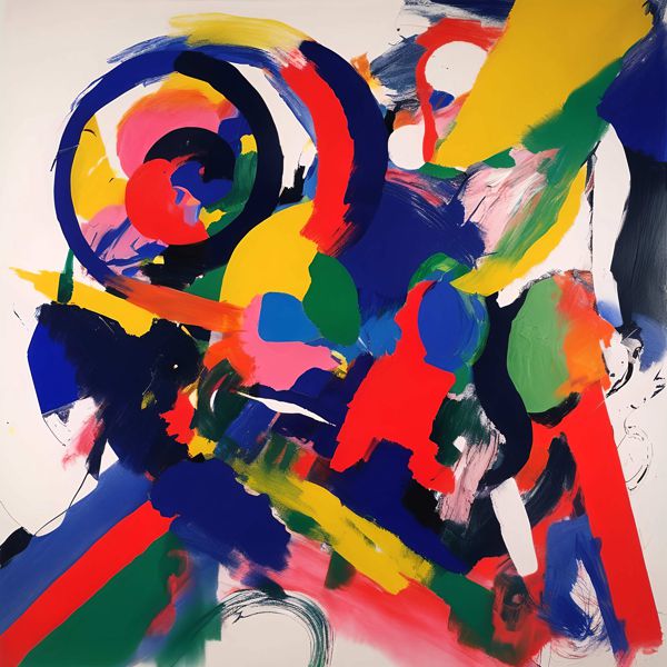 この絵は,抽象表現主義の影響を強く受けた作品です. 色彩の大胆な使用と動的な筆致が特徴で,ポロックやウィレム・デ・クーニングのようなアーティストの影響が感じられます. 色の選択は非常に鮮やかで,視覚的なエネルギーを生み出しています. 円や曲線が多用されており,カンディンスキーのような抽象画家の影響も見られます. 全体として,感情や動きを表現することに重点が置かれており,観る者に強い印象を与えます. 色と形の組み合わせが,視覚的なリズムを生み出し,観る者を絵の中に引き込む力を持っています.