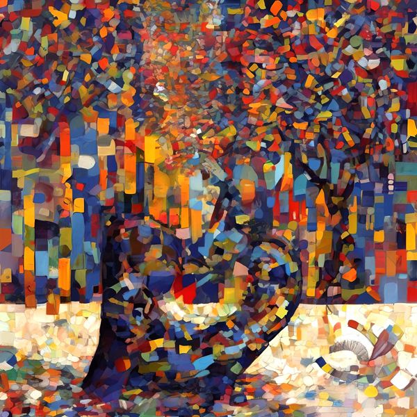 制作者と AI (AI アート作成用のプログラム Stable Diffusion XL 1.0 (1024)) とからなるアートユニット カナブストラクド によるアート画像です.そのプログラムに「Kanabstracd surrealism Seurat」ということば (prompt) をあたえて創造させました. 負のプロンプトとして「Seurat barbeds」を指定しています.