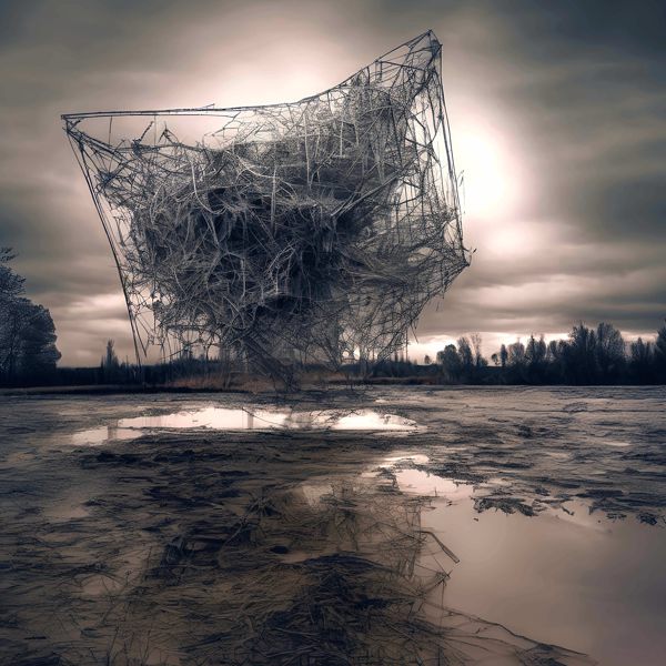これらの画像は通常の AI アートとはちがう独自の方法を使って作っています. AI アートは AI にプロンプト (または呪文) とよばれる英語の記述をあたえて作画した画像ですが, Stable Diffusion,DALL・E 2,Midjourney などの AI プログラムによって 2022 年に爆発的に普及しました. AI アートで望む画像を作るために通常は比較的細かい指示を与えます. しかしデイシンではおもに 1〜4 語程度の短いことばや造語を Stable Diffusion XL 1.0 (1024) を使用している OpenArt,NightCafe などのウェブサイトで使用して,そのプログラムがもつ知識をいかして自由に (ジェネラティブに,創発的に) 画像をつくらせています. コントラストの調整等はしていますが,描きなおさせたり加筆したりするようなことはしていません.