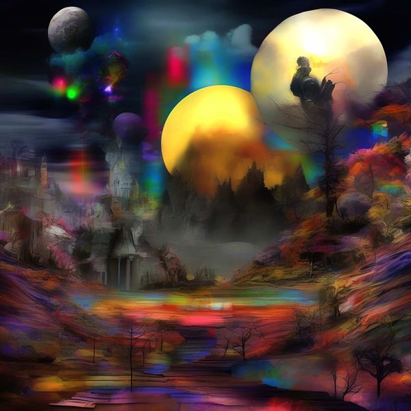 これらの画像は通常の AI アートとはちがう独自の方法を使って作っています. AI アートは AI にプロンプト (または呪文) とよばれる英語の記述をあたえて作画した画像ですが, Stable Diffusion,DALL・E 2,Midjourney などの AI プログラムによって 2022 年に爆発的に普及しました. AI アートで望む画像を作るために通常は比較的細かい指示を与えます. しかしデイシンではおもに 1〜4 語程度の短いことばや造語を Stable Diffusion XL 1.0 (1024) を使用している OpenArt,NightCafe などのウェブサイトで使用して,そのプログラムがもつ知識をいかして自由に (ジェネラティブに,創発的に) 画像をつくらせています. コントラストの調整等はしていますが,描きなおさせたり加筆したりするようなことはしていません.