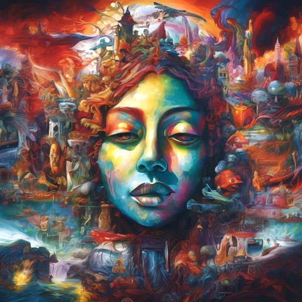 これらの画像は通常の AI アートとはちがう独自の方法を使って作っています. AI アートは AI にプロンプト (または呪文) とよばれる英語の記述をあたえて作画した画像ですが, Stable Diffusion,DALL・E 2,Midjourney などの AI プログラムによって 2022 年に爆発的に普及しました. AI アートで望む画像を作るために通常は比較的細かい指示を与えます. しかしデイシンではおもに 1〜4 語程度の短いことばや造語を Stable Diffusion XL 1.0 (1024) を使用している OpenArt,NightCafe などのウェブサイトで使用して,そのプログラムがもつ知識をいかして自由に (ジェネラティブに,創発的に) 画像をつくらせています. コントラストの調整等はしていますが,描きなおさせたり加筆したりするようなことはしていません.