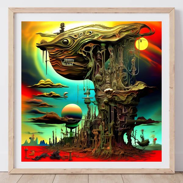 この絵は,シュルレアリスムとサイケデリックアートの影響を強く受けているように見えます. ダリやH.R.ギーガーの作品を思わせる,幻想的で複雑な構造が特徴です. 異世界的な風景と有機的な形状が組み合わさり,見る者を不思議な世界へと誘います. 色彩は鮮やかで,特に赤と緑の対比が印象的です. 空に浮かぶ惑星や雲の形状は,宇宙的な広がりを感じさせます. 全体として,現実と夢の境界を曖昧にし,観る者に多様な解釈を促す作品です.