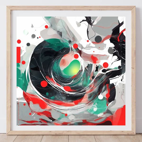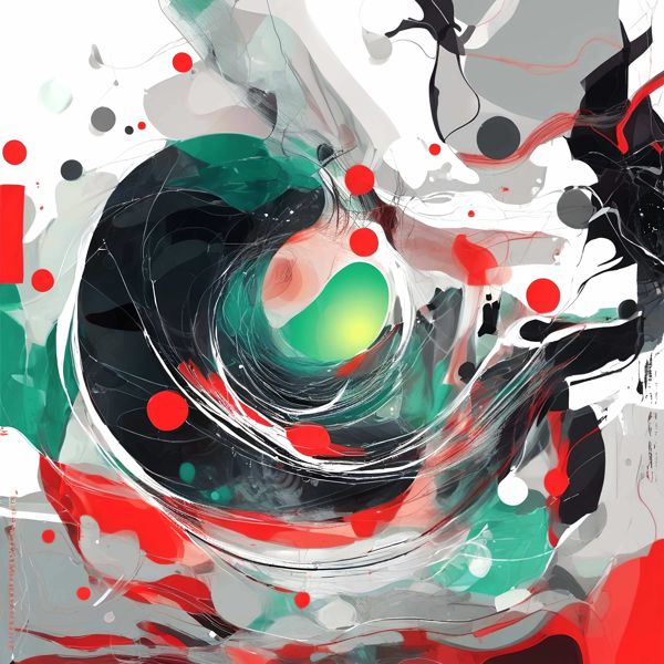 中央に渦を巻くような構図がまず目を引き,緑の核が内側から発光するような印象を与えます. 黒と白の鋭い線描が渦の流れを形作り,赤い円点が画面全体にリズムを刻んで引き締めています. 半透明の色層が重なり合うことで奥行きと速度感が生まれ,見る角度や時間によって表情が変化するダイナミックな作風です.