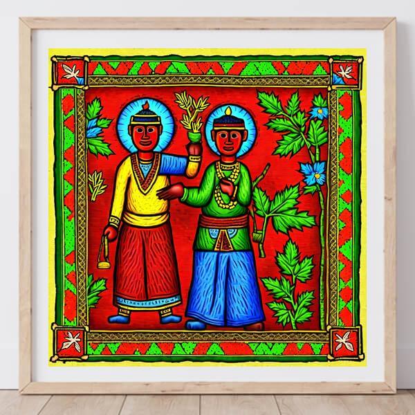 AI アートでは通常 A6 サイズ相当くらい (縦横 500〜1000 ピクセルくらい) の荒い画像しかつくれないので,超解像という技術をつかって原画より解像度を 4〜8 倍に (こまかく) しています. ただし,上の商品画像の解像度は原画と同程度なのでご注意ください.