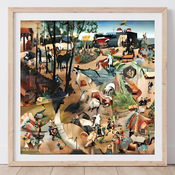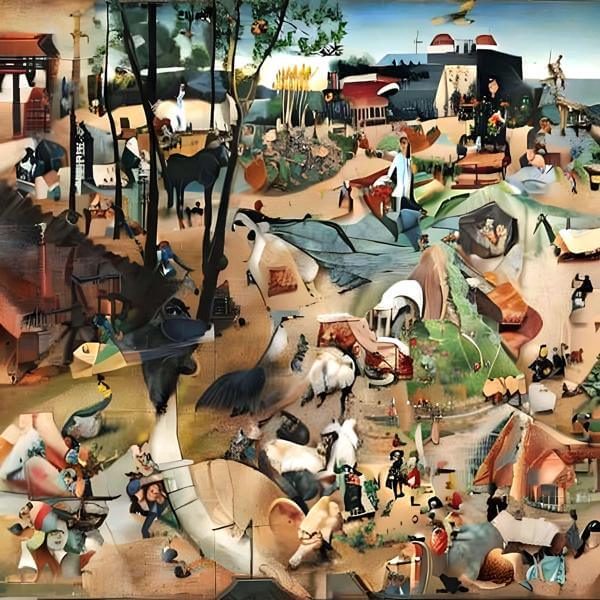 制作者と AI (AI アート作成用のプログラム ) とからなるアートユニット anonymous による画家風のアート画像です.そのプログラムに「Hieronymus_Bosch」ということば (prompt) をあたえて創造させました. 負のプロンプトとして「HBosch」を指定しています.