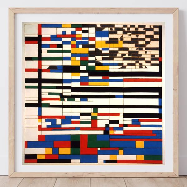 制作者と AI (AI アート作成用のプログラム Stable Diffusion XL 1.0 (1024)) とからなるアートユニット カナブストラクド によるアート画像です.そのプログラムに「Yasusi_Kanada Mondrian」ということば (prompt) をあたえて創造させました. 負のプロンプトとして「Mondrian」を指定しています.