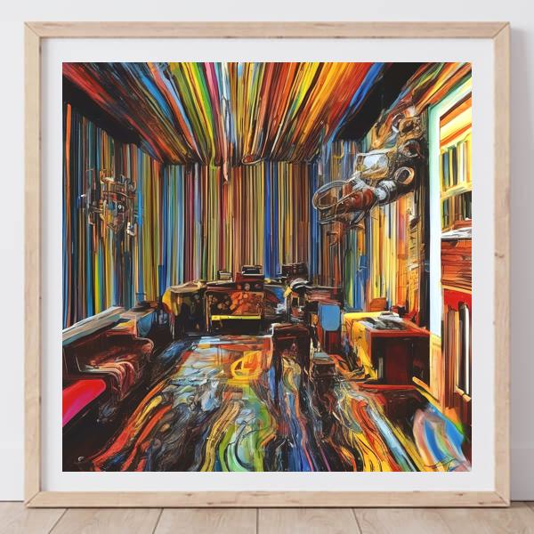 部屋の内部は,現実と幻想が交錯するような不思議な空間を作り出しています. 壁や天井,床に至るまで,色とりどりのストライプが流れ,視覚的なリズムを生み出しています. 家具や装飾品は,抽象的に描かれ,具体的な形状を持ちながらも,色彩の渦に溶け込んでいます.