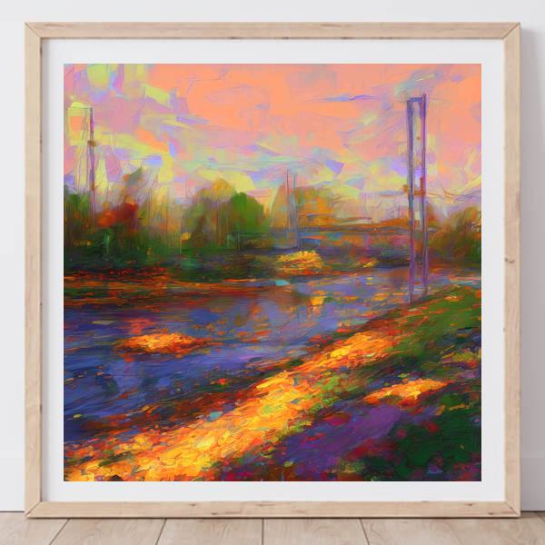 AI アートでは通常 A6 サイズ相当くらい (縦横 500〜1000 ピクセルくらい) の荒い画像しかつくれないので,超解像という技術をつかって原画より解像度を 4〜8 倍に (こまかく) しています. ただし,上の商品画像の解像度は原画と同程度なのでご注意ください.