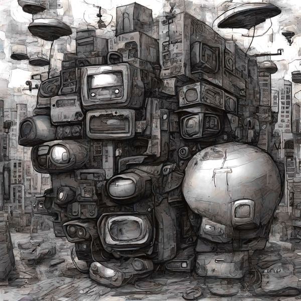 これらの画像は通常の AI アートとはちがう独自の方法を使って作っています. AI アートは AI にプロンプト (または呪文) とよばれる英語の記述をあたえて作画した画像ですが, Stable Diffusion,DALL・E 2,Midjourney などの AI プログラムによって 2022 年に爆発的に普及しました. AI アートで望む画像を作るために通常は比較的細かい指示を与えます. しかしデイシンではおもに 1〜4 語程度の短いことばや造語を Stable Diffusion XL 1.0 (1024) を使用している OpenArt,NightCafe などのウェブサイトで使用して,そのプログラムがもつ知識をいかして自由に (ジェネラティブに,創発的に) 画像をつくらせています. コントラストの調整等はしていますが,描きなおさせたり加筆したりするようなことはしていません.