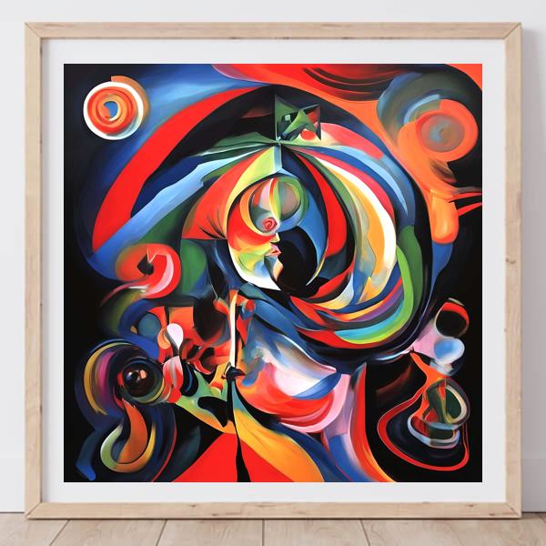 この作品は鮮烈な色彩と渦巻く有機的な形が幾何学的な面と溶け合い,見る者を画面中央へと誘う抽象画です. 赤・青・黄を基調にした高純度の色面が折り重なり,曲線と鋭角が交錯することで奥行きと躍動感が生まれます. 部分的に顔や器物を想起させる輪郭が現れたり消えたりするため,視線は常に画面内を巡り,光と影のコントラストが緊張感を添えています.