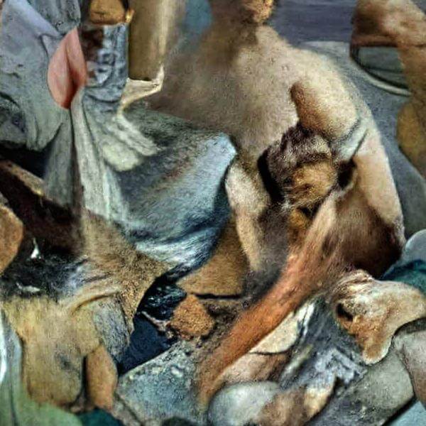 これらの画像は通常の AI アートとはちがう独自の方法を使って作っています. AI アートは AI にプロンプト (または呪文) とよばれる英語の記述をあたえて作画した画像ですが, Stable Diffusion,DALL・E 2,Midjourney などの AI プログラムによって 2022 年に爆発的に普及しました. AI アートで望む画像を作るために通常は比較的細かい指示を与えます. しかしデイシンではおもに 1〜4 語程度の短いことばや造語を Stable Diffusion 1.5 を使用している OpenArt,NightCafe などのウェブサイトで使用して,そのプログラムがもつ知識をいかして自由に (ジェネラティブに,創発的に) 画像をつくらせています. コントラストの調整等はしていますが,描きなおさせたり加筆したりするようなことはしていません.