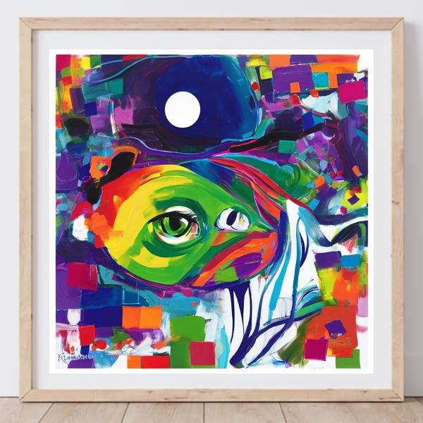 AI アートでは通常 A6 サイズ相当くらい (縦横 500〜1000 ピクセルくらい) の荒い画像しかつくれないので,超解像という技術をつかって原画より解像度を 4〜8 倍に (こまかく) しています. ただし,上の商品画像の解像度は原画と同程度なのでご注意ください.