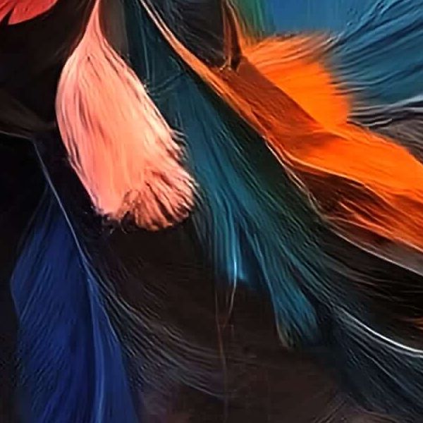 AI アートでは通常 A6 サイズ相当くらい (縦横 500〜1000 ピクセルくらい) の荒い画像しかつくれないので,超解像という技術をつかって原画より解像度を 4〜8 倍に (こまかく) しています. ただし,上の商品画像の解像度は原画と同程度なのでご注意ください.