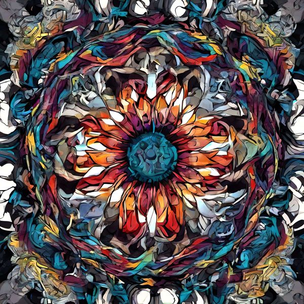これらの画像は通常の AI アートとはちがう独自の方法を使って作っています. AI アートは AI にプロンプト (または呪文) とよばれる英語の記述をあたえて作画した画像ですが, Stable Diffusion,DALL・E 2,Midjourney などの AI プログラムによって 2022 年に爆発的に普及しました. AI アートで望む画像を作るために通常は比較的細かい指示を与えます. しかしデイシンではおもに 1〜4 語程度の短いことばや造語を Stable Diffusion XL 1.0 (1024) を使用している OpenArt,NightCafe などのウェブサイトで使用して,そのプログラムがもつ知識をいかして自由に (ジェネラティブに,創発的に) 画像をつくらせています. コントラストの調整等はしていますが,描きなおさせたり加筆したりするようなことはしていません.