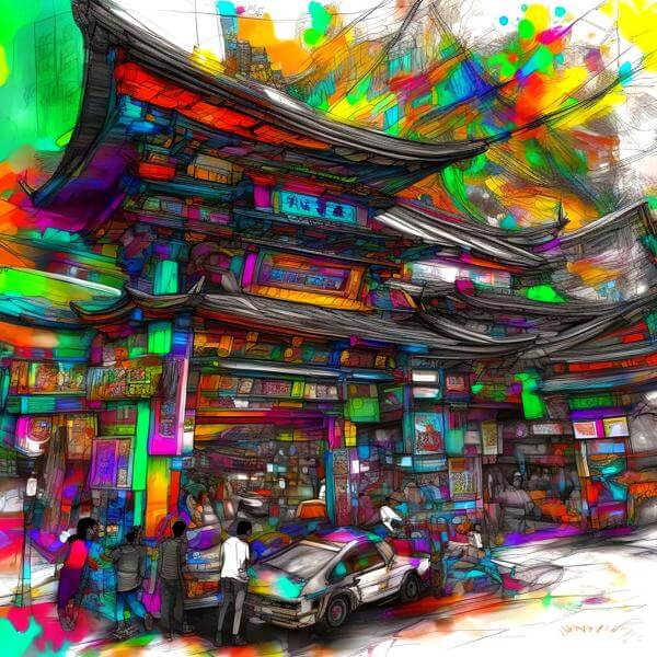 これらの画像は通常の AI アートとはちがう独自の方法を使って作っています. AI アートは AI にプロンプト (または呪文) とよばれる英語の記述をあたえて作画した画像ですが, Stable Diffusion,DALL・E 2,Midjourney などの AI プログラムによって 2022 年に爆発的に普及しました. AI アートで望む画像を作るために通常は比較的細かい指示を与えます. しかしデイシンではおもに 1〜4 語程度の短いことばや造語を Stable Diffusion XL 1.0 (1024) を使用している OpenArt,NightCafe などのウェブサイトで使用して,そのプログラムがもつ知識をいかして自由に (ジェネラティブに,創発的に) 画像をつくらせています. コントラストの調整等はしていますが,描きなおさせたり加筆したりするようなことはしていません.