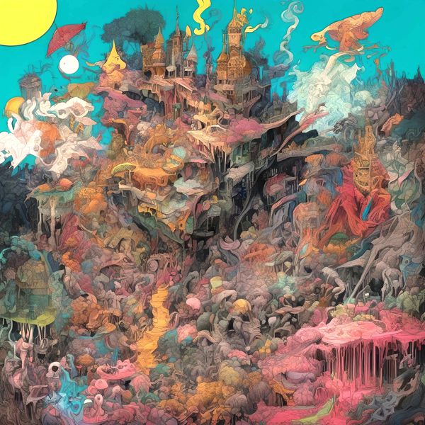 制作者と AI (AI アート作成用のプログラム Stable Diffusion XL 1.0 (1024)) とからなるアートユニット カナブストラクド によるアート画像です.そのプログラムに「Kanabstracd fantasy absurdism」ということば (prompt) をあたえて創造させました. 負のプロンプトとして「checker」を指定しています.