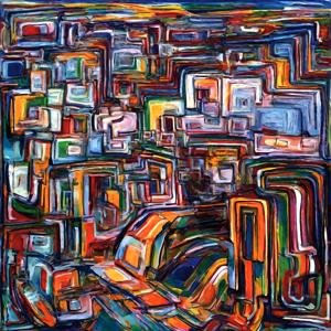 創作者と AI とで構成されるアートユニット「カナブストラクド (Kanabstracd)」による,織物パターンに影響されない作品をあつめました.つまり,抽象画を中心に描くカナブストラクド (Kanabstracd) というつづりを正のプロンプトにし,織物 (fabric) などを負のプロンプトにいれて描いています.カナブストラクドという名前をプロンプトとすることは署名のような意味をもちます.AI には著作権がないため,創作者が選んだ上位の作品は創作者の著作権つきのものとかんがえています.