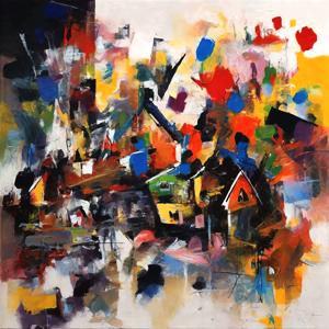 創作者と AI とで構成されるアートユニット「カナブストラクド (Kanabstracd)」による,結び目パターンに影響されない作品をあつめました.つまり,抽象画を中心に描くカナブストラクド (Kanabstracd) というつづりを正のプロンプトにし,結び目パターン (knot pattern),結び目テクスチャ (knot texture) などを負のプロンプトにいれて描いています.カナブストラクドという名前をプロンプトとすることは署名のような意味をもちます.AI には著作権がないため,創作者が選んだ上位の作品は創作者の著作権つきのものとかんがえています.