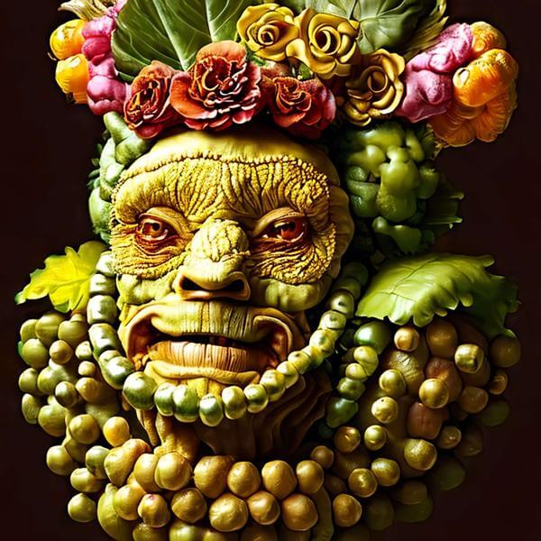 制作者と AI (AI アート作成用のプログラム Stable Diffusion 2.1 (768)) とからなるアートユニット anonymous による画家風のアート画像です.そのプログラムに「arcimboldo」ということば (prompt) をあたえて創造させました. 負のプロンプトとして「severini」を指定しています.