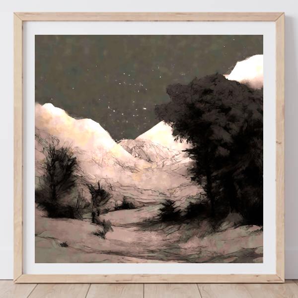 AI アートでは通常 A6 サイズ相当くらい (縦横 500〜1000 ピクセルくらい) の荒い画像しかつくれないので,超解像という技術をつかって原画より解像度を 4〜8 倍に (こまかく) しています. ただし,上の商品画像の解像度は原画と同程度なのでご注意ください.