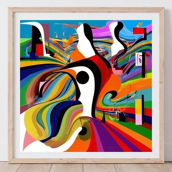 表現の出発点にはワシリー・カンディンスキーの色彩とリズム,ソニア・ドローネーの色面リズム,マティスの大胆な色使いや切り絵的な構成,さらにミロの有機的モチーフや未来派・オプアート的な運動性の影響が感じられます. 現代のストリートアートやデジタル抽象の技法を取り込みつつ,伝統的な抽象表現を新しい視覚語法で再解釈した一作であり,鑑賞者それぞれが色と形の交差点で物語を見つけられるでしょう.