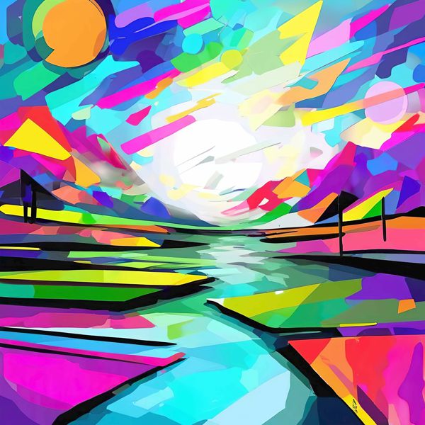 色彩表現や平面構成にはアンリ・マティスのフォーヴィスム的な色使い,ワシリー・カンジンスキーやパウル・クレーの抽象的リズム感,さらにデヴィッド・ホックニーの鮮烈な風景観が映り込み,ステンドグラスのような色面分割と現代的なレイヤー処理が融合しています. ウェブ上でご覧いただく際には,色と形の対話をどう感じ取っていただけるかを楽しんでいただければ幸いです.