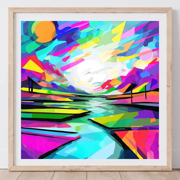 鮮やかな色面が河面へと収束してゆくこの作品は,幾何学的な断片が光をはじき返すようなリズムを持ち,見る人を中央の光へと導きます. 暖色と寒色が大胆に隣り合う配色は,抽象化された風景の中に昼と夜,静と動の対比を生み,デジタルならではのクリアな発色が空間の深みと軽やかさを同時に演出しています.