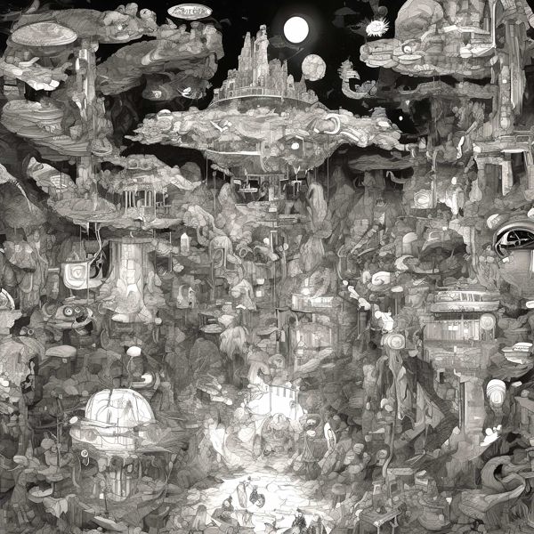 これらの画像は通常の AI アートとはちがう独自の方法を使って作っています. AI アートは AI にプロンプト (または呪文) とよばれる英語の記述をあたえて作画した画像ですが, Stable Diffusion,DALL・E 2,Midjourney などの AI プログラムによって 2022 年に爆発的に普及しました. AI アートで望む画像を作るために通常は比較的細かい指示を与えます. しかしデイシンではおもに 1〜4 語程度の短いことばや造語を Stable Diffusion XL 1.0 (1024) を使用している OpenArt,NightCafe などのウェブサイトで使用して,そのプログラムがもつ知識をいかして自由に (ジェネラティブに,創発的に) 画像をつくらせています. コントラストの調整等はしていますが,描きなおさせたり加筆したりするようなことはしていません.