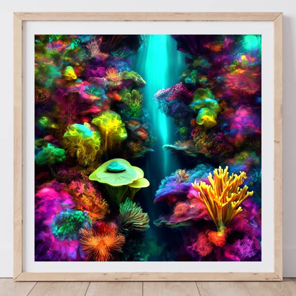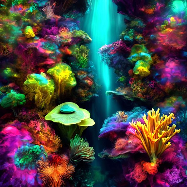 制作者と AI (AI アート作成用のプログラム Stable Diffusion XL 1.0 (1024)) とからなるアートユニット カナブストラクド によるアート画像です.そのプログラムに「Kanabstracd surreal reef」ということば (prompt) をあたえて創造させました. 負のプロンプトとして「reef」を指定しています.