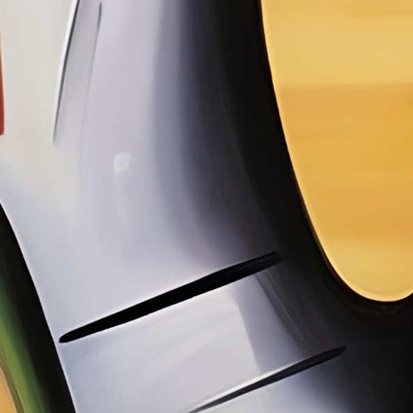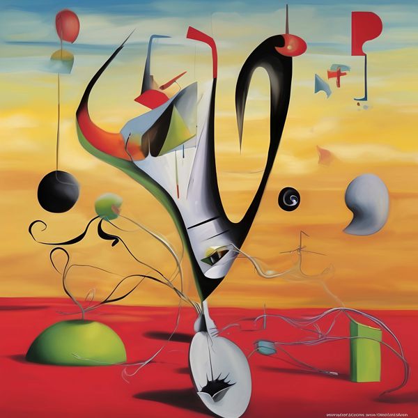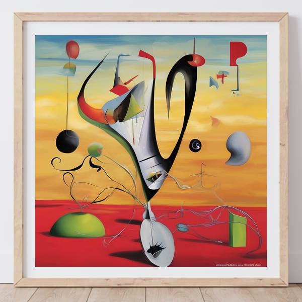 色彩の対比が印象的な一枚です. 地平線に溶けるような黄橙の空と赤い大地を背景に,浮遊する球体や角張った立方,細い線で結ばれた有機的な形が散りばめられ,現実と夢の境界を曖昧にします. 中央の黒い曲線は書道的な一筆のように画面を貫き,目や口を想起させる要素が観る者の注意を引きます. 滑らかなグラデーションと硬質な影が同居し,平面でありながら奥行きを感じさせる構図になっています.