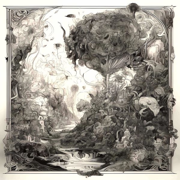 これらの画像は通常の AI アートとはちがう独自の方法を使って作っています. AI アートは AI にプロンプト (または呪文) とよばれる英語の記述をあたえて作画した画像ですが, Stable Diffusion,DALL・E 2,Midjourney などの AI プログラムによって 2022 年に爆発的に普及しました. AI アートで望む画像を作るために通常は比較的細かい指示を与えます. しかしデイシンではおもに 1〜4 語程度の短いことばや造語を Stable Diffusion XL 1.0 (1024) を使用している OpenArt,NightCafe などのウェブサイトで使用して,そのプログラムがもつ知識をいかして自由に (ジェネラティブに,創発的に) 画像をつくらせています. コントラストの調整等はしていますが,描きなおさせたり加筆したりするようなことはしていません.