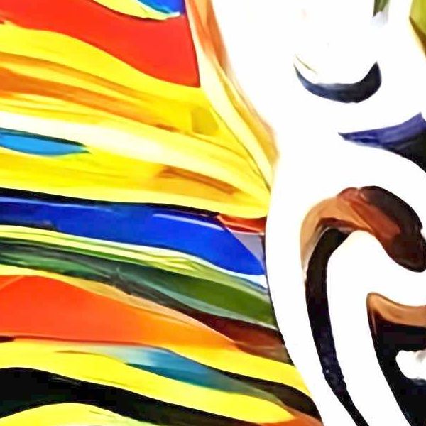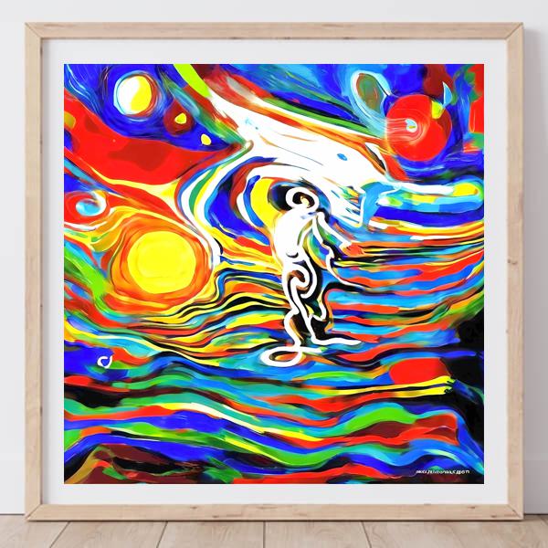 画面いっぱいに強い赤や青,黄が渦を巻き,中央には白い輪郭の人物が立っているように見えます. 周囲の線は波のように流れ,足元から空へとつながって視線が上へ引き上げられます. 左の大きな黄色は太陽にも灯りにも見え,右上の円は惑星のように見えます. 上方の白い形は鳥やクジラを思わせ,現実と夢の境目にいる感覚をつくります. 色の響きが音楽のように広がります.