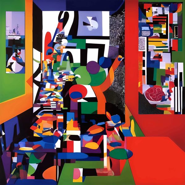 制作者と AI (AI アート作成用のプログラム Stable Diffusion XL 1.0 (1024)) とからなるアートユニット カナブストラクド によるアート画像です.そのプログラムに「Kanabstracd absurdism Picasso」ということば (prompt) をあたえて創造させました. 負のプロンプトとして「Picasso bows」を指定しています.