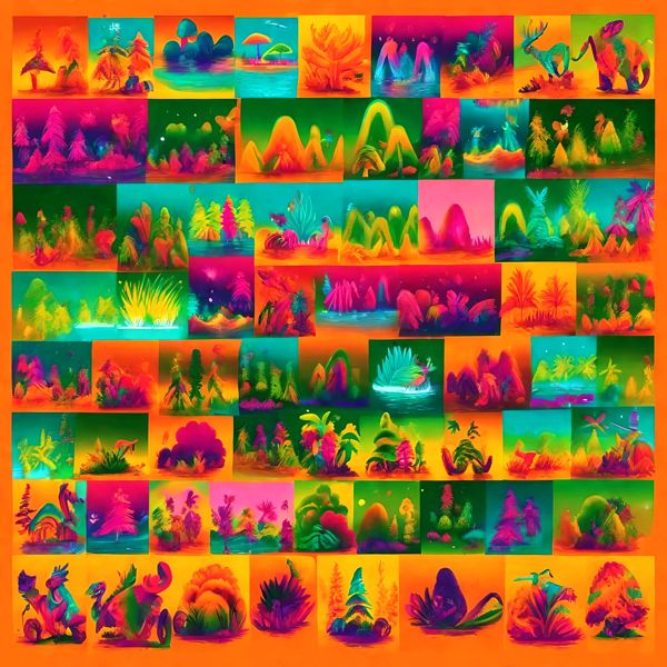 これらの画像は通常の AI アートとはちがう独自の方法を使って作っています. AI アートは AI にプロンプト (または呪文) とよばれる英語の記述をあたえて作画した画像ですが, Stable Diffusion,DALL・E 2,Midjourney などの AI プログラムによって 2022 年に爆発的に普及しました. AI アートで望む画像を作るために通常は比較的細かい指示を与えます. しかしデイシンではおもに 1〜4 語程度の短いことばや造語を Stable Diffusion XL 1.0 (1024) を使用している OpenArt,NightCafe などのウェブサイトで使用して,そのプログラムがもつ知識をいかして自由に (ジェネラティブに,創発的に) 画像をつくらせています. コントラストの調整等はしていますが,描きなおさせたり加筆したりするようなことはしていません.