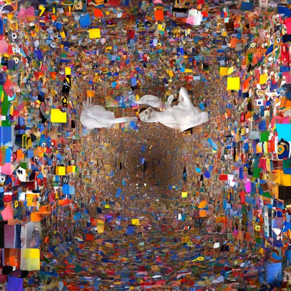 これらの画像は通常の AI アートとはちがう独自の方法を使って作っています. AI アートは AI にプロンプト (または呪文) とよばれる英語の記述をあたえて作画した画像ですが, Stable Diffusion,DALL・E 2,Midjourney などの AI プログラムによって 2022 年に爆発的に普及しました. AI アートで望む画像を作るために通常は比較的細かい指示を与えます. しかしデイシンではおもに 1〜4 語程度の短いことばや造語を Stable Diffusion XL 1.0 (1024) を使用している OpenArt,NightCafe などのウェブサイトで使用して,そのプログラムがもつ知識をいかして自由に (ジェネラティブに,創発的に) 画像をつくらせています. コントラストの調整等はしていますが,描きなおさせたり加筆したりするようなことはしていません.