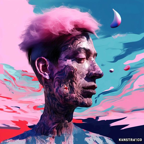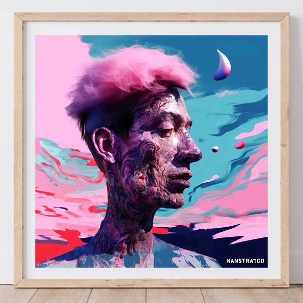 この作品は横向きの人物像を主題に,肌が彫刻のように刻まれたテクスチャと柔らかなパステルが同居する,夢と現実の境界を曖昧にするイメージです. 瞳を閉じた表情は内省的な静けさを湛え,髪や背景に広がるピンクやシアンの流線は感情の波動を視覚化しているかのようです. 浮遊するしずくや抽象的な波紋が空間に奥行きを与え,観る者を幻想的な時間へと誘います.