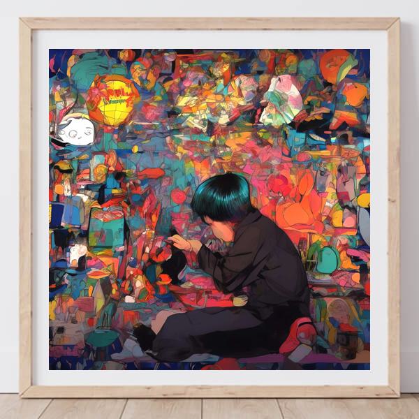 In AI art, the images generated are usually quite rough—about the size of an A6 print (roughly 500–1000 pixels on each side). To make them suitable for presentation, I use a technique called super-resolution, which increases the resolution 4–8 times higher than the original, adding finer detail. However, please note that the resolution of the product image shown above is about the same as the original and has not been upscaled.