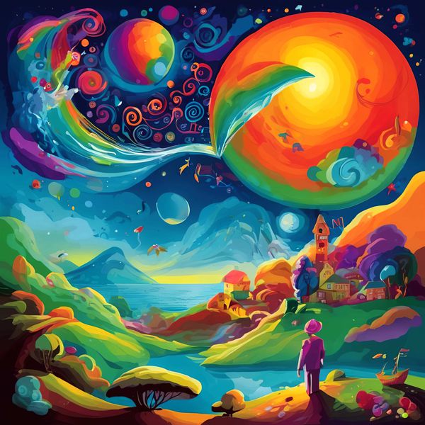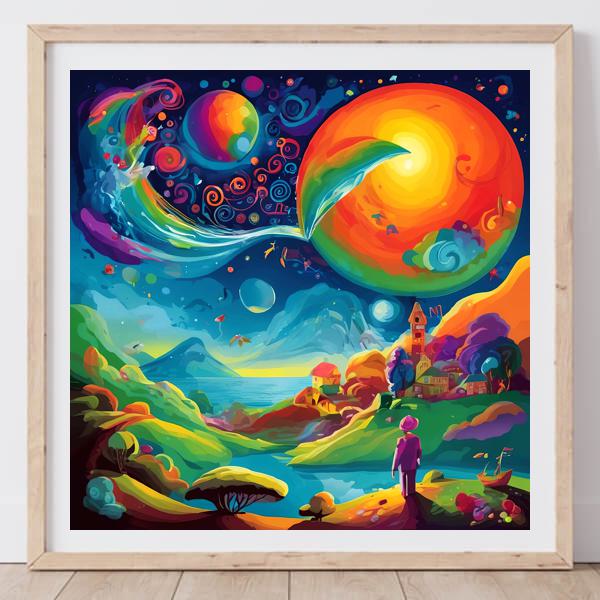 また浮遊する人物像や村の詩的な佇まいはシャガールの夢想的世界を想起させ,本作が西洋近代の抽象表現と民俗的幻想を巧みに融合していることを示しています. 鮮やかなグラデーションと滑らかな境界,レイヤー感のある色面処理はデジタル絵画の手法を思わせ,観る者に内的な旅と宇宙的な広がりを同時に感じさせる表現になっています.