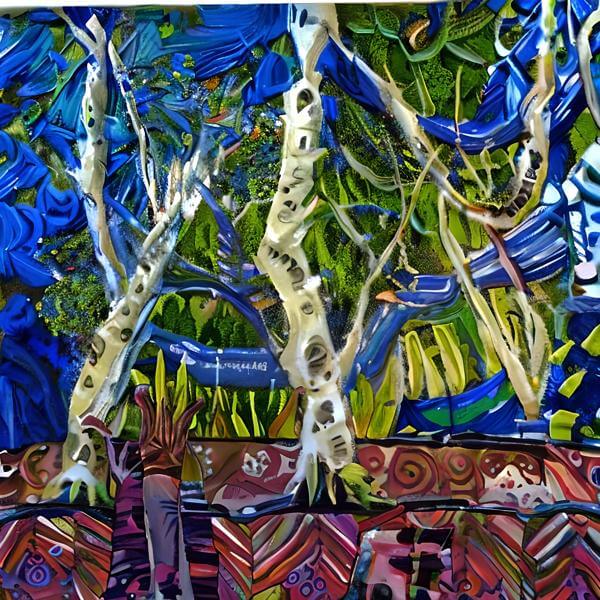 これらの画像は通常の AI アートとはちがう独自の方法を使って作っています. AI アートは AI にプロンプト (または呪文) とよばれる英語の記述をあたえて作画した画像ですが, Stable Diffusion,DALL・E 2,Midjourney などの AI プログラムによって 2022 年に爆発的に普及しました. AI アートで望む画像を作るために通常は比較的細かい指示を与えます. しかしデイシンではおもに 1〜4 語程度の短いことばや造語を Stable Diffusion 2.1 (768) を使用している OpenArt,NightCafe などのウェブサイトで使用して,そのプログラムがもつ知識をいかして自由に (ジェネラティブに,創発的に) 画像をつくらせています. コントラストの調整等はしていますが,描きなおさせたり加筆したりするようなことはしていません.
