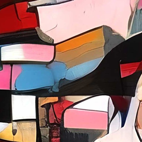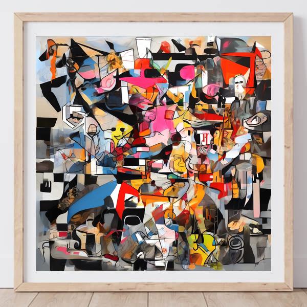 この絵は,抽象表現主義とキュビズムの影響を受けた作品のように見えます. 色彩の豊かさと形の多様性が特徴で,ポロックやピカソの作品を思わせます. カラフルなパレットが視覚的なエネルギーを生み出し,視線を引きつけます. 形状は幾何学的でありながらも流動的で,動きとリズムを感じさせます. 黒い線が全体を引き締め,構成に統一感を与えています. 視覚的なカオスの中に,隠された物語や感情が潜んでいるように感じられます. 観る者に解釈の自由を与え,個々の想像力を刺激する作品です.