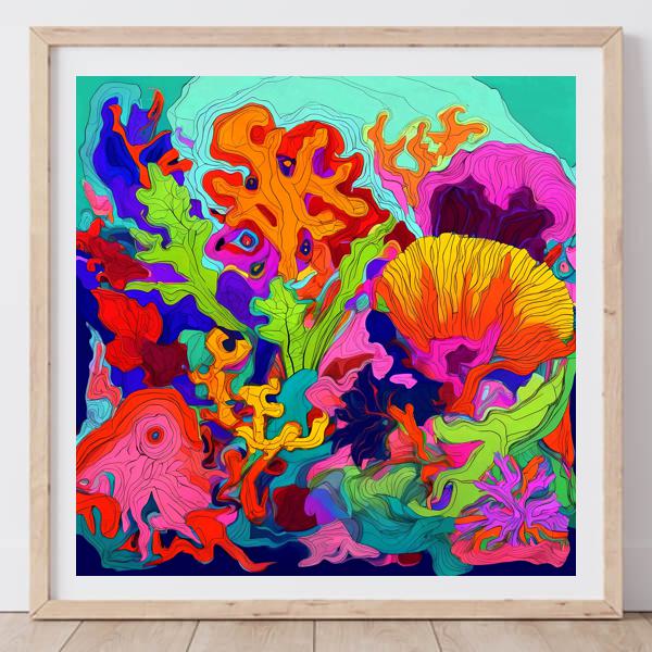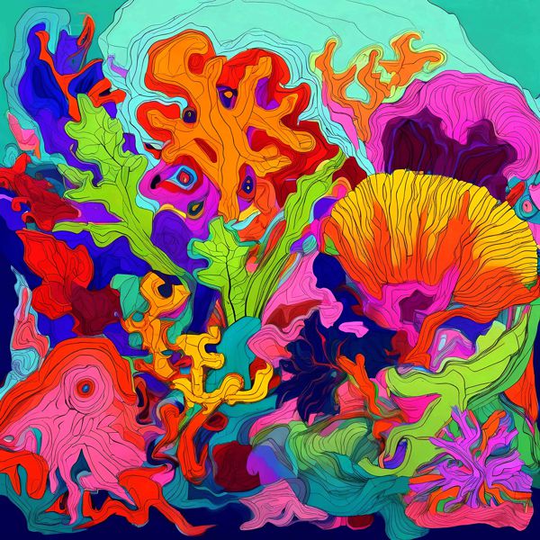 制作者と AI (AI アート作成用のプログラム Stable Diffusion XL 1.0 (1024)) とからなるアートユニット カナブストラクド によるアート画像です.そのプログラムに「Kanabstracd reef」ということば (prompt) をあたえて創造させました. 負のプロンプトとして「reef checker」を指定しています.