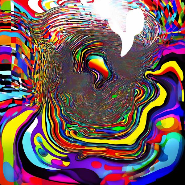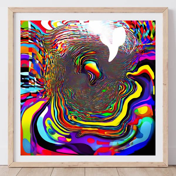 鮮烈な原色が螺旋状にうねり,中央の白い余白へと視線を誘う本作は,デジタル技法による層状描画と色彩の極端なコントラストで構成されています. カンディンスキーの抽象的色面やヴァザレリ,ブリジット・ライリーらのオプアート的律動,さらに現代の生成アートやグリッチ表現の影響が感じられ,手描きのブラシストロークを模したテクスチャーやノイズ層,パラメトリック変形が複合的に用いられています.