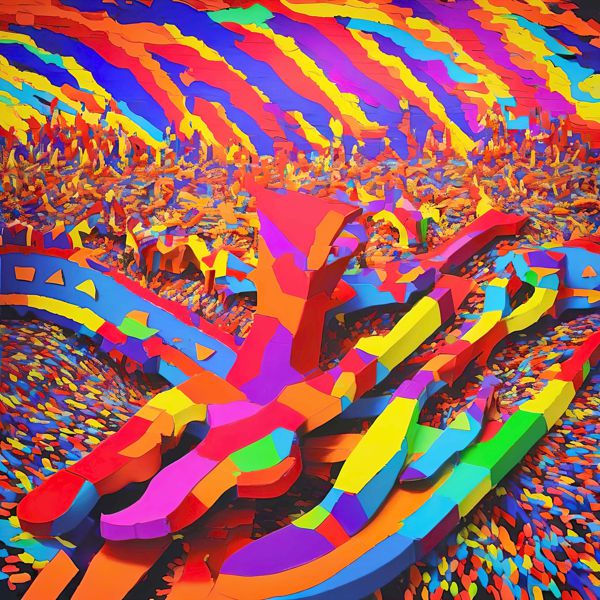 これらの画像は通常の AI アートとはちがう独自の方法を使って作っています. AI アートは AI にプロンプト (または呪文) とよばれる英語の記述をあたえて作画した画像ですが, Stable Diffusion,DALL・E 2,Midjourney などの AI プログラムによって 2022 年に爆発的に普及しました. AI アートで望む画像を作るために通常は比較的細かい指示を与えます. しかしデイシンではおもに 1〜4 語程度の短いことばや造語を Stable Diffusion XL 1.0 (1024) を使用している OpenArt,NightCafe などのウェブサイトで使用して,そのプログラムがもつ知識をいかして自由に (ジェネラティブに,創発的に) 画像をつくらせています. コントラストの調整等はしていますが,描きなおさせたり加筆したりするようなことはしていません.