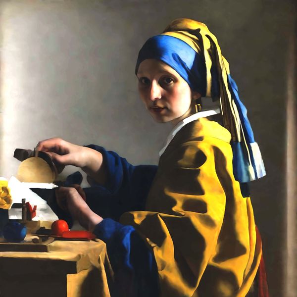 制作者と AI (AI アート作成用のプログラム Stable Diffusion XL 1.0 (1024)) とからなるアートユニット カナブストラクド によるアート画像です.そのプログラムに「Kanabstacd Vermeer01」ということば (prompt) をあたえて創造させました.