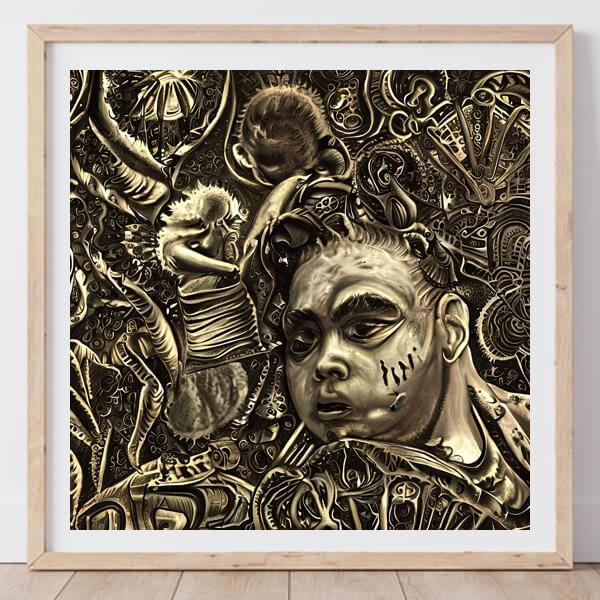 AI アートでは通常 A6 サイズ相当くらい (縦横 500〜1000 ピクセルくらい) の荒い画像しかつくれないので,超解像という技術をつかって原画より解像度を 4〜8 倍に (こまかく) しています. ただし,上の商品画像の解像度は原画と同程度なのでご注意ください.