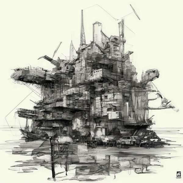 これらの画像は通常の AI アートとはちがう独自の方法を使って作っています. AI アートは AI にプロンプト (または呪文) とよばれる英語の記述をあたえて作画した画像ですが, Stable Diffusion,DALL・E 2,Midjourney などの AI プログラムによって 2022 年に爆発的に普及しました. AI アートで望む画像を作るために通常は比較的細かい指示を与えます. しかしデイシンではおもに 1〜4 語程度の短いことばや造語を Stable Diffusion XL 1.0 (1024) を使用している OpenArt,NightCafe などのウェブサイトで使用して,そのプログラムがもつ知識をいかして自由に (ジェネラティブに,創発的に) 画像をつくらせています. コントラストの調整等はしていますが,描きなおさせたり加筆したりするようなことはしていません.