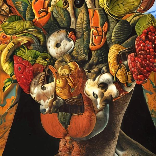 制作者と AI (AI アート作成用のプログラム ) とからなるアートユニット anonymous による画家風のアート画像です.そのプログラムに「Arcimboldo」ということば (prompt) をあたえて創造させました. 負のプロンプトとして「Arcimboldo」を指定しています.